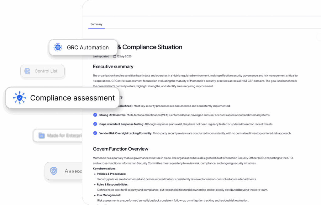 GRCentric is a converged platform that combines the power of AI models with security maturity & compliance frameworks. We eliminate manual documents review, fragmanted tools and repetitive assessments, so mid-size consulting firms can deliver at scale.